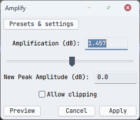 - When you open Amplify, Audacity calculates the maximum amplification that won’t cause clipping and shows a suggested value; you can also enter a custom dB value. Positive values increase volume while negative values decreases it.
