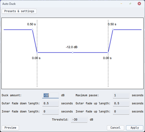 - Auto Duck is a specific Audacity effect that automatically lowers the volume of a chosen track (usually music) whenever another track (usually voice) is playing, based on a sidechain-like relationship you define.