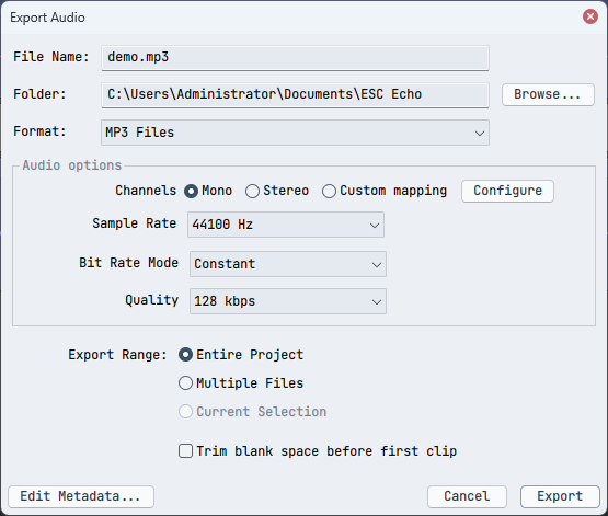 - Exporting is the process of rendering and saving your Audacity project as a standard audio file (WAV, MP3, FLAC, etc.) so it can be played outside Audacity, uploaded, or distributed.