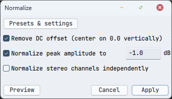 - When you run Normalize you set a target peak (for example -1 dB) and Audacity scales all samples proportionally so the highest peak matches that level.