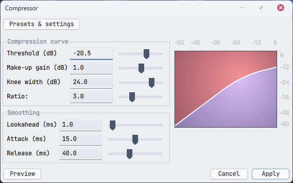 - Compressor evens out inconsistent voice levels, makes quiet words easier to hear without raising background noise, and helps the voice sit better with music.
