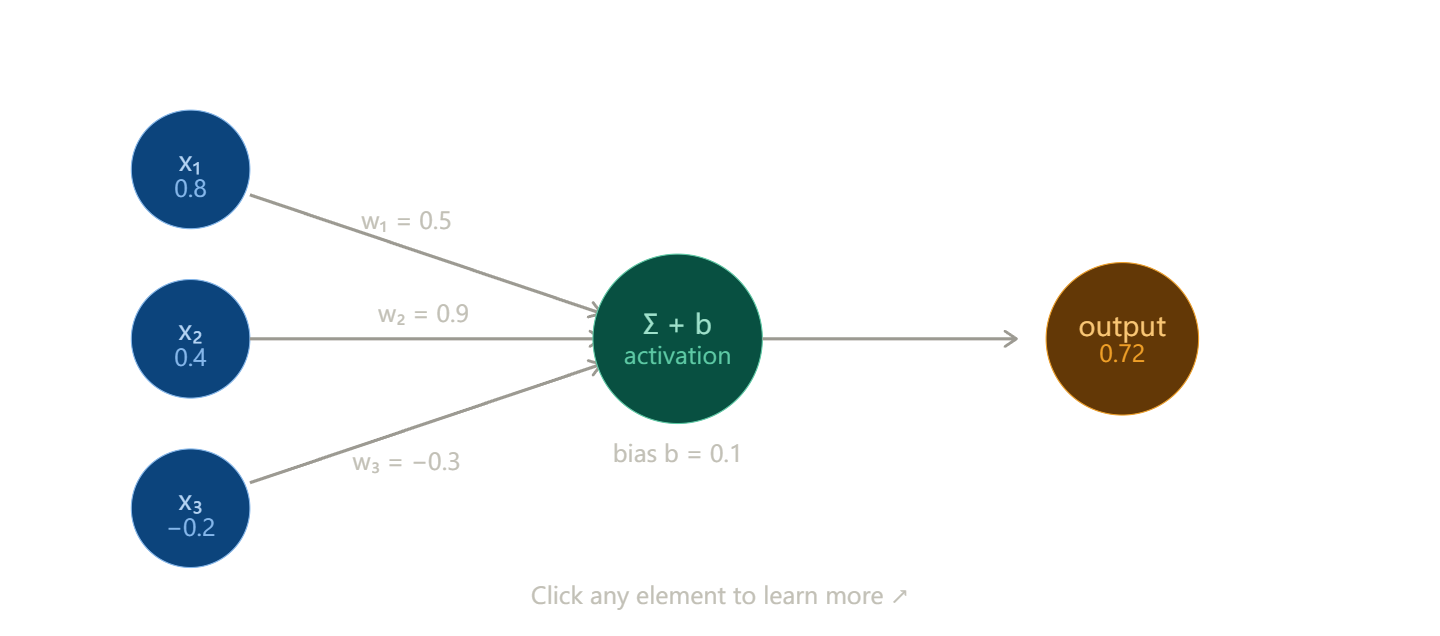 The formula is simple: output = activation(w₁x₁ + w₂x₂ + … + wₙxₙ + b)