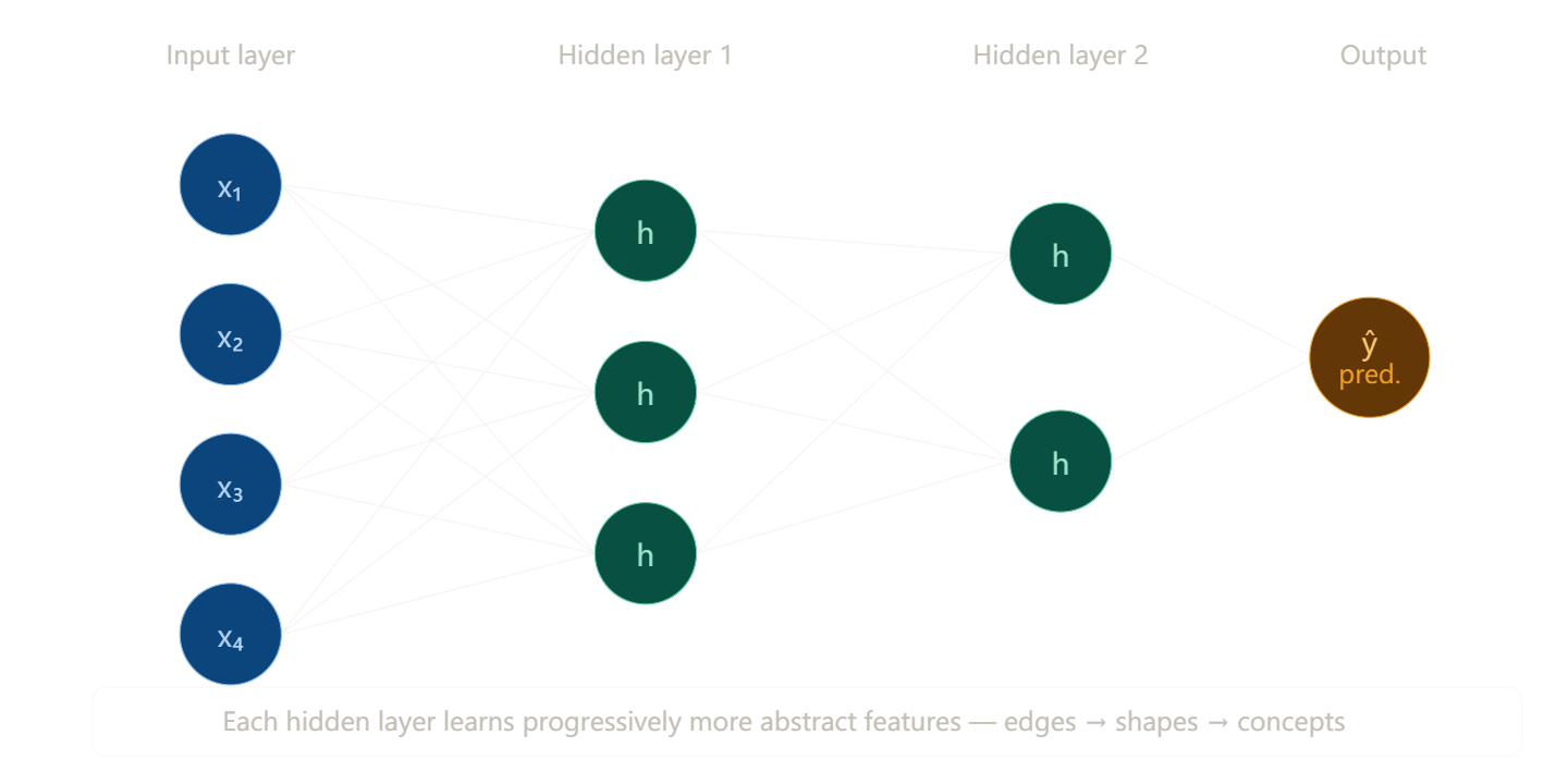 A single neuron is limited. Real power comes from stacking layers. The input layer receives raw data, hidden layers learn intermediate representations, and the output layer produces a prediction.---